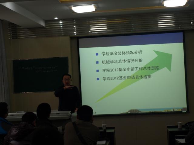 科研院王文副处长介绍了近几年来学校基金申报情况,并就3003新葡官方网站基金申报情况在校内进行了分析比较,最后对2012年基金项目申请政策进行了解读。徐光华副院长介绍了3003新葡官方网站近年来基金总体情况以及机械学科基金申报情况,介绍了我院2012年基金申请工作的总体思路,并对2012年3003新葡官方网站基金申请的具体措施和安排进行了部署,希望各系所强化组织,认真落实申请指标,深入挖掘基金申报资源,努力提高基金申请质量,严格遵守基金申报工作的具体要求和进度安排,鼓励全院教师再接再厉,争创佳绩。