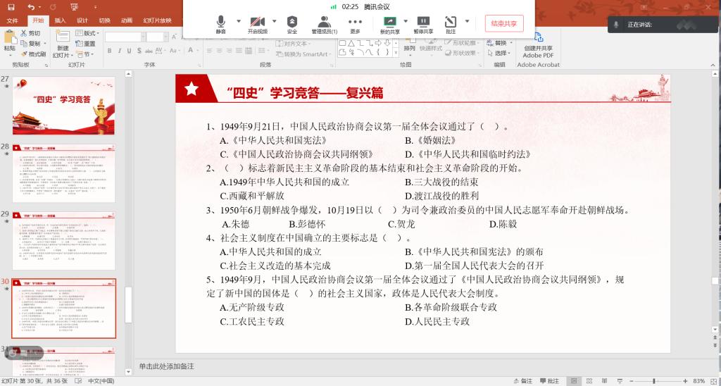 最后,主持人对本次会议内容进行总结,“四史”集中学习教育让大家可以更好的了解新中国的历史,“四史”交流中,大家各抒己见,促进了思想的交流,而“四史”知识竞答,巩固了四史知识。希望所有同志再接再厉,献礼建党100周年。