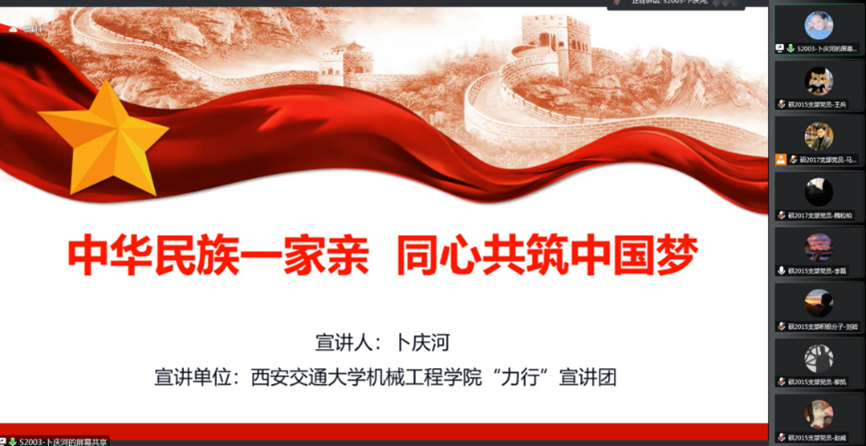 首先,由卜庆河同志带领大家从中华民族共同体的角度,学习“为全面建设社会主义现代化国家、全面推进中华民族伟大复兴而团结奋斗!”这一党的二十大重要精神。最后在《唱支山歌给党听》的歌声中结束并总结了中华民族伟大复兴的中国梦。