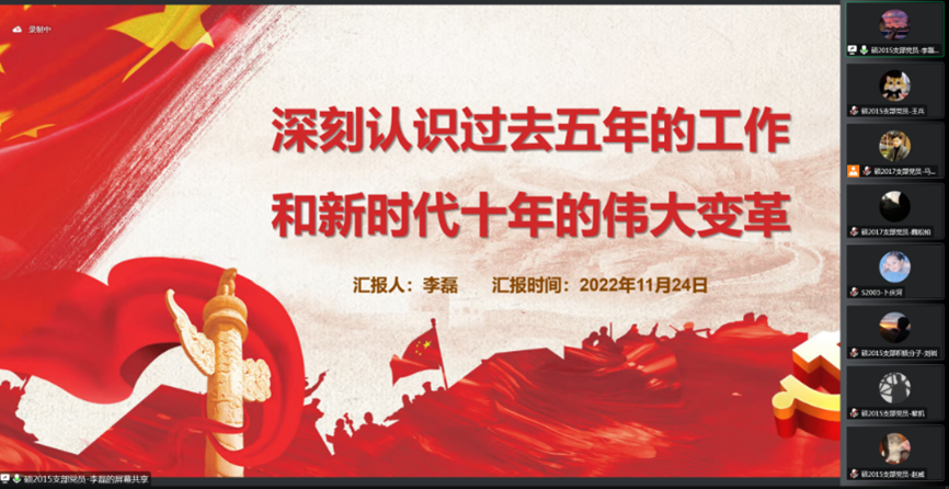 为深入学习贯彻党的二十大精神,充分发挥党员先锋和党支部战斗堡垒作用,进一步加强党支部自身建设,增强党支部凝聚力,硕2015党支部和硕2017党支部于11月24日21:30在腾讯会议联合召开了“携手共学二十大,支部共建聚合力”支部共建专题组织生活。此次会议由硕2017党支部书记马畅欣同志主持,邀请到了力行宣讲团成员李磊、卜庆河两位同志进行宣讲分享,最后由硕2015党支部书记赵威同志分享学习总结。