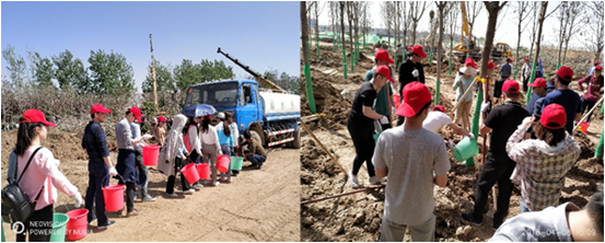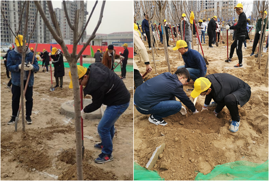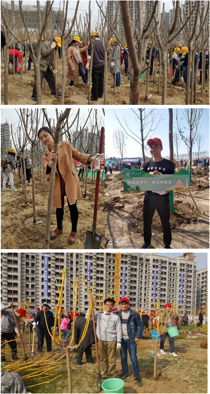 在植树过程中,大家彼此分工明确,对于虚软松散的土地,就用铁锨除土挖坑,对于较硬的地面,男生们就挥起鹤嘴锄刨坑去石,大家干得热火朝天。时而看到扛着小树苗过来的,时而看到提着小红桶打水的,时而又看到拥抱着自己的小树苗拍照留影的。没过多久,一棵棵小树苗就伫立在了创新港这片土地上了。
