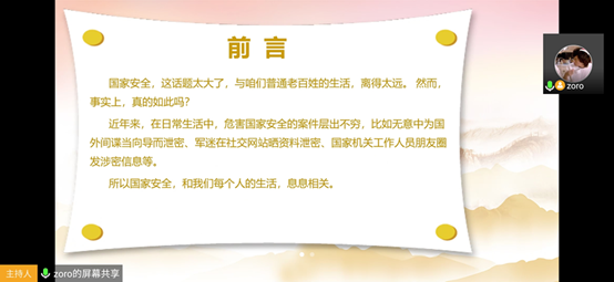 2020424日星期五晚七点,硕9012-13-15党支部于腾讯会议平台开展了守护国家安全主题会议。本次会议围绕全民国家安全教育日,就国家安全的内容、当今国内外形势、如何维护国家安全等问题进行了展开。会议由支部书记陈航航主持,裴圣华、郭强、王春江、王永辉、何普等6人参加了会议。