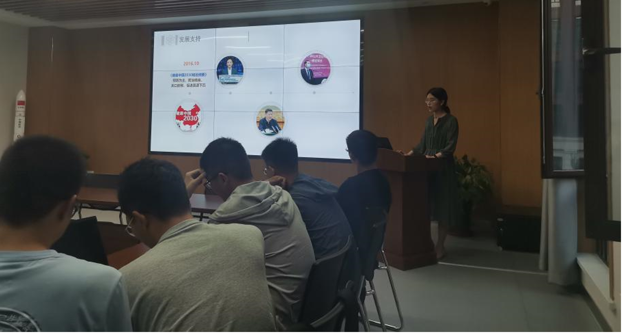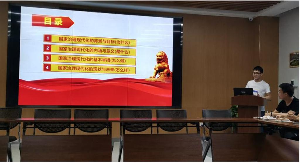 会上,鲁思伟同学为我们分享了国家治理体系的相关知识。他从治理现代化这一概念的提出入手,先后讲解了其产生的背景与目标,以及历史使命所赋予的深刻内涵。在此基础上,他结合实例,分析了国家治理现代化的一系列基本举措。为了让我们更直观地了解到国家几十年来的沧桑变化,他在汇报过程中引入了一段央视新闻,通过对百姓的走访调查,真实而客观的反映了民众对国家政策的认同感与满足度。最后,鲁思伟同学分析了当代国家治理体系不成熟的一面,并就国家未来发展提出了自己独到的见解。