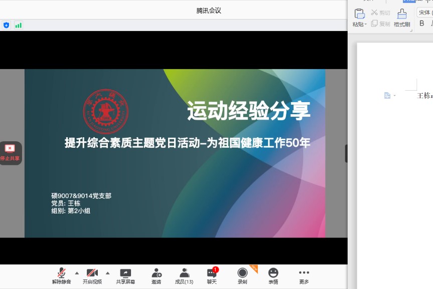7月29日,硕9007/9014班党支部开展了主题为“提升综合素质”的组织生活会。考虑到部分同学已赴各地参加社会实践,此次组织生活会以线上线下相结合的方式进行。