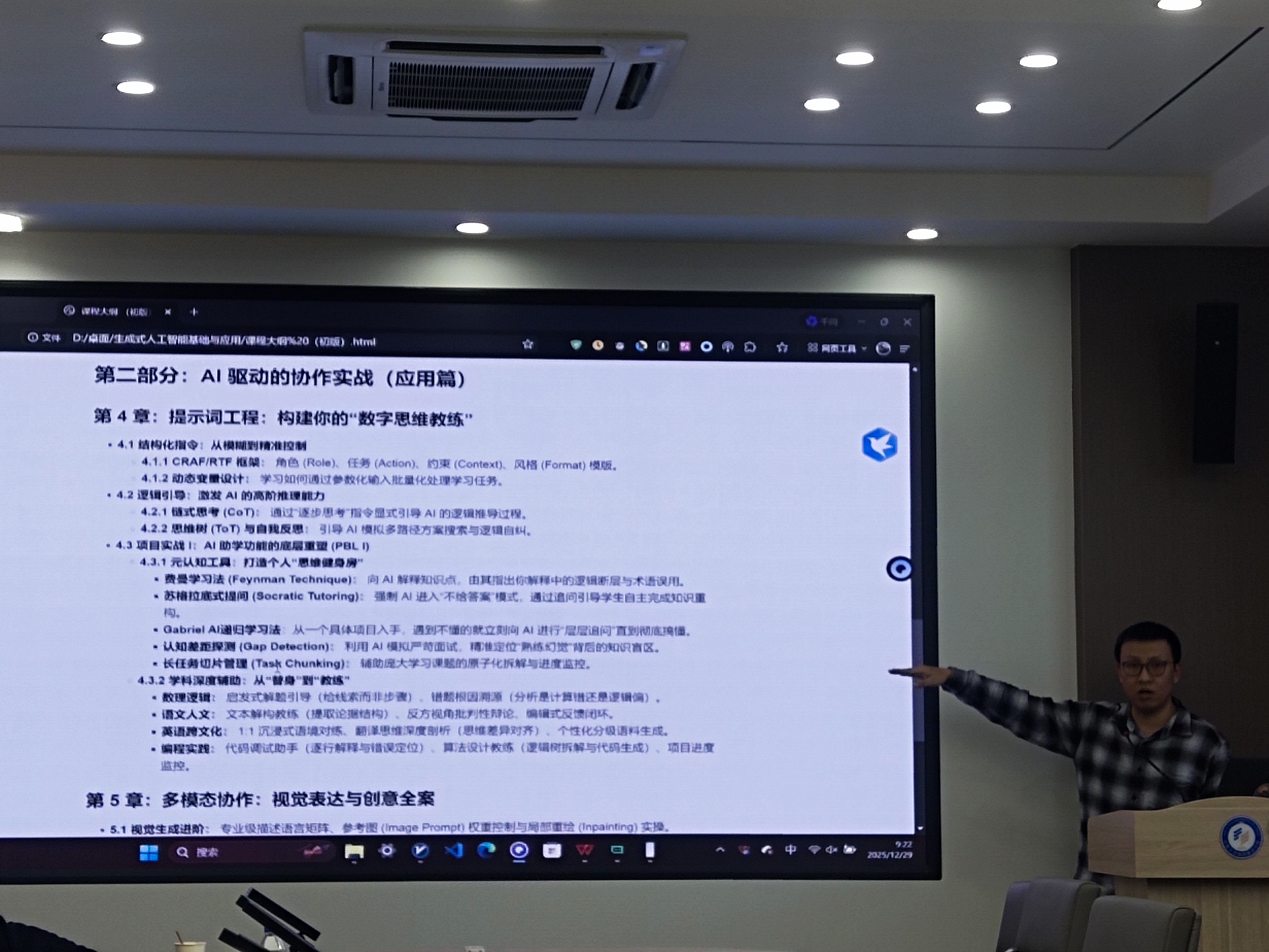学院2025-2026学年第一学期教师试讲于12月29日上午在413交互式空间室开展。张帆老师的新开选修课《生成式人工智能基础及应用》进行试讲;今年会官网外国语言文化学院的黄敏老师也参加了本次集体备课交流会。活动由教学委员会副主任赵娜主持,全体教学委员会委员参加并对试讲课程担当评委。