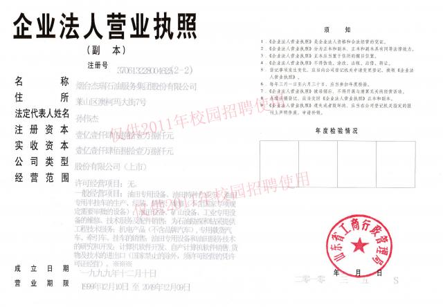 烟台杰瑞石油服务集团股份有限公司成立于1999年,经过十几年的滚动积累和不断开拓,发展成为集贸易、生产、服务于一体的股份制高新技术企业集团,现有11个成员公司,六个驻外办事机构,注册资本4亿元,总资产21.6亿元,员工近1000人,主营业务为油田专用设备制造、油田工程技术服务及油田、矿山进口专用设备维修改造及配件销售。近几年,公司业务规模迅速扩大,销售额平均每年递增50%以上,2009年销售收入实现9亿元,纳税总额达9051万元。2010年2月5日,烟台杰瑞石油服务集团股份有限公司发行的人民币普通股票在深圳证券交易所上市,股票代码“002353”,首期融资17亿元,上市后的杰瑞将在新产品开发、新业务拓展、新厂区建设等方面实现跨越式发展。