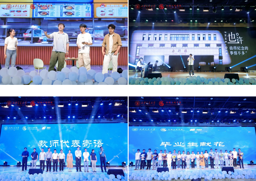 晚会第二篇章舞蹈《Lucifer》充满张力,以每一舞步表达青春之力;小品《终极毕业计划》轻松幽默中藏着不舍与祝福;歌曲《思念是一种病》诉说友情的挂念与柔情。《凤凰花开的路口》口琴与钢琴交织,讲述毕业的感伤与前行。教师代表寄语与毕业献花环节,则为晚会注入最真挚的祝福。十一位来自各所的教授、支书依次上台,寄语未来。毕业生代表向老师献花致谢,台上台下皆为动容。