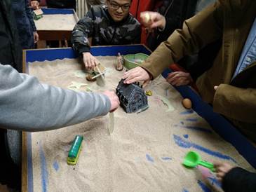 第二个参观的是心理沙盘室,老师在这里向同学们介绍了心理沙盘治疗是国际上一种很流行的心理治疗方法,沙盘游戏可以用于儿童或者成人,个体或者团体,沙盘游戏主要由沙子和人或者物的微缩模型两个部分构成,咨询者可以通过发挥自身的想象力利用道具摆出自己的心灵故事,从而使得心理咨询师或治疗师了解到咨询者无意识的一种表达与内心的一些认知,为后续的心理咨询与治疗提供有用的信息。在心理沙盘室,同学们都非常积极地提出各种问题,很多同学还发挥想象力摆出了一些心理沙盘的形状。