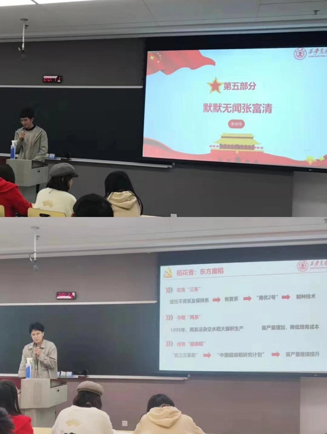 李传祥同学全面介绍了老英雄张富清的一生,从五个方面评价了这位老英雄:当兵的神话、深藏功与名、权力不及亲、永远在路上、心中无小我,最后用一句话概括就是:“73年党龄,60多年深藏功名,他用自己的朴实纯粹、淡泊名利,书写了自己精彩的人生。”连旭升同学从袁隆平院士的早年经历、科研之路、东方魔稻和元勋美梦四个方面,为我们展示了一位稻田的守望者,同时做着“禾下乘凉梦”与“杂交水稻覆盖全球梦”的令世人敬佩的伟人。