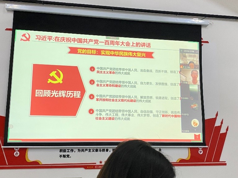 会议第一部分中,本支部的周佳佳同志为大家讲解了习近平总书记在建党百年大会上的讲话精神相关内容。在讲解中,周佳佳同志基于习近平总书记的讲话总结了中国共产党一百年来的光辉历程,并展望中国共产党站在了新的历史进程上,将要走向新的征程。