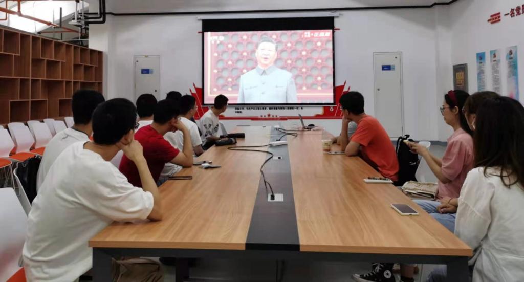 在庆典上,习近平总书记回顾了中国共产党的历史。在那个满目疮痍的旧中国,需要革命,需要改革,在历经多次失败的革命后,中国的道路在哪里?中国的未来又在何方?中国共产党的出现宛如一颗火种,在他的带领下,全国各族人民前赴后继、顽强奋斗,挽救了那个处于水深火热的中国。在总书记激昂的述词下,党支部全体同志内心涌动,对革命先烈的敬意油然而生。历经了种种磨难,一个由中国共产党带领下的全新中国不断奋斗、创造和积累,开辟了一条最适合中国国情的中国特色社会主义道路,形成了中国特色社会主义理论体系,确立了中国特色社会主义制度。在中华民族和中华人民的支持下,党与人民紧密联系,全心全意为中华民族谋复兴,为中华人民谋幸福。我们要继续坚持党的领导,高举中国特色社会主义伟大旗帜,向着第二个百年目标不断发展与进步。整个典礼过程中,大家认真观看,不但学习深化总书记的指导,并为自己为这样伟大组织衷的一份子而感到自豪。站在新的历史节点上,我们仅仅完成了第一步,还要继续努力奋斗,坚定迈出更多、更大的步伐,坚持共产党的领导,才能在新的历史起点上把中国特色社会主义伟大事业全面向前进。