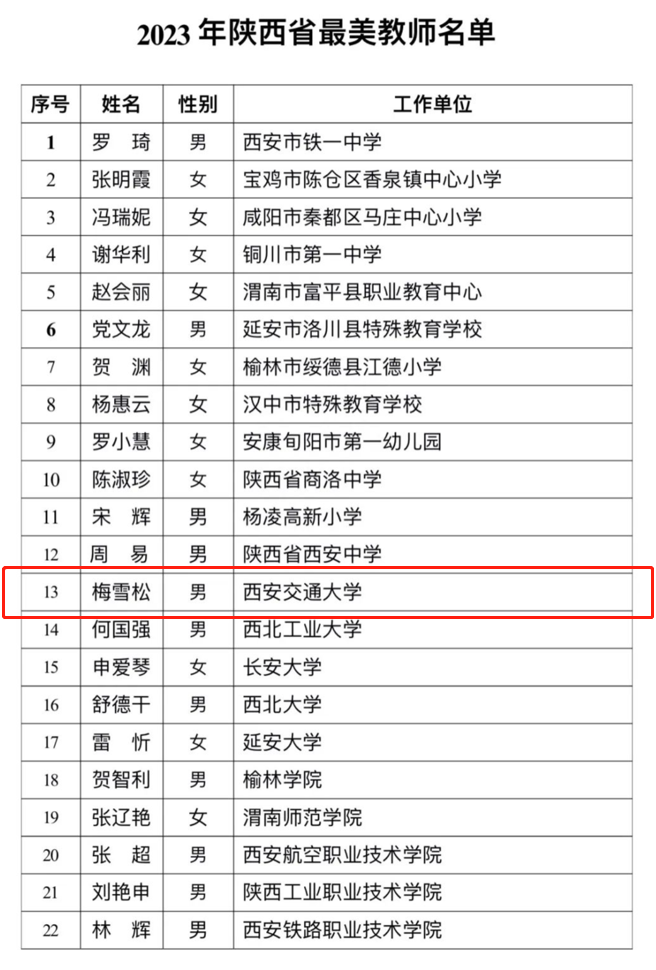 近日,陕西教育新闻网公布了2023年陕西省最美教师名单,西安交大3003新葡官方网站梅雪松教授入选。