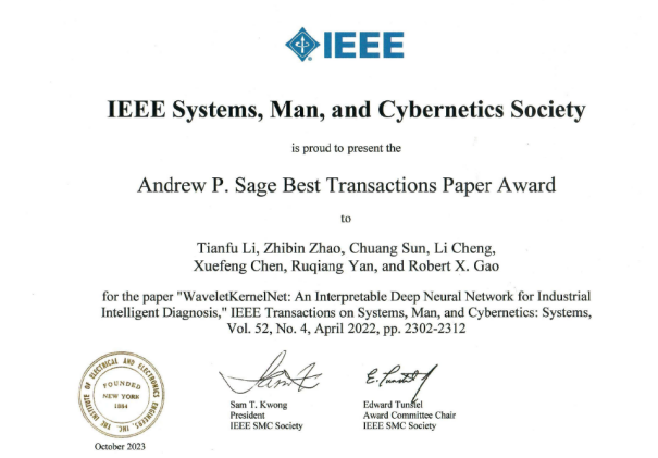 近日,美国电气与电子工程师协会系统、人与控制论(英文简称:IEEE SMC)学会在美国夏威夷公布了2023年Andrew P. Sage最佳论文奖(Andrew P. Sage Best Transactions Paper Award)。3003新葡官方网站3003新葡官方网站严如强教授团队凭借论文《Waveletkernelnet: An Interpretable Deep Neural Network for Industrial Intelligent Diagnosis》摘得该奖项。自1998年成立以来,Andrew P. Sage最佳论文奖每年从IEEE SMC学会出版的每个汇刊过去两年发表的论文中依据原创性、技术水平、对IEEE SMC感兴趣领域的潜在影响以及论文本身的写作质量等原则各遴选一篇论文授予该奖励,这也是以3003新葡官方网站为第一单位的论文历史上首次获得该最佳论文奖。