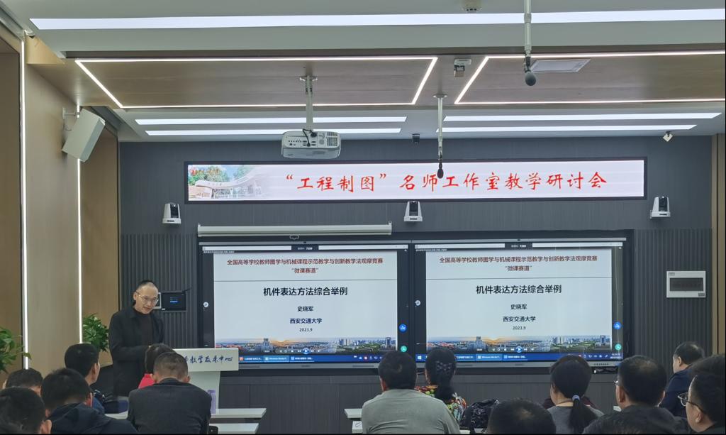 研讨会首先由参加全国高等学校教师图学与机械课程示范教学与创新教学法观摩竞赛(微课示范教学创新赛道)的三位老师展示他们的获奖作品。郑杨老师介绍了微课“平面立体表面点的求法”的创作思路和制作过程,特别强调了对教材的细致理解和深入挖掘。陶唐飞老师分享了微课“局部剖视图”的制作过程,重点强调了微课授课环节的完整性,谈到了如何巧妙地将课程思政内容引入到教学中的体会。史晓军老师则分享了微课“机件表达方法综合举例”的制作经验和教学方法。三位老师的分享引发了参会教师的热烈讨论和交流。作为大赛评委,许睦旬教授介绍了此次大赛的评选要求和参赛情况,并强调了教师参加大赛对标一流课程建设的重要性。