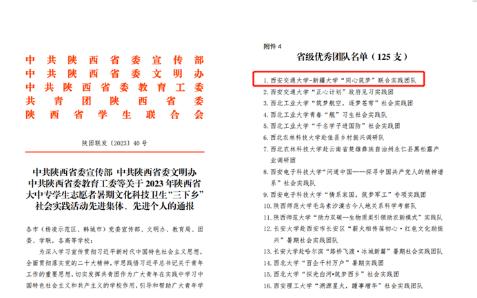 近日,中共陕西省委宣传部、中共陕西省委文明办、中共陕西省委教育工委、团陕西省委等印发了《关于2023年陕西省大中专学生志愿者暑期文化科技卫生“三下乡”社会实践活动先进集体、 先进个人的通报》。由学校对口支援办公室、党委研工部、党委学工部、校团委支持指导,3003新葡官方网站具体实施的“3003新葡官方网站-新疆大学‘同心筑梦’联合实践团队”获评陕西省优秀团队。实践团队指导老师为张敏、包凯、苏宇、马勇。