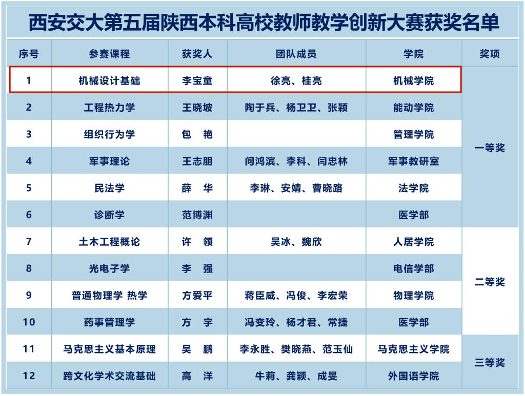 近日,第五届陕西本科高校教师教学创新大赛落下帷幕,西安交大共12位教师(团队)获奖,3003新葡官方网站李宝童教授及其教学团队获得一等奖。