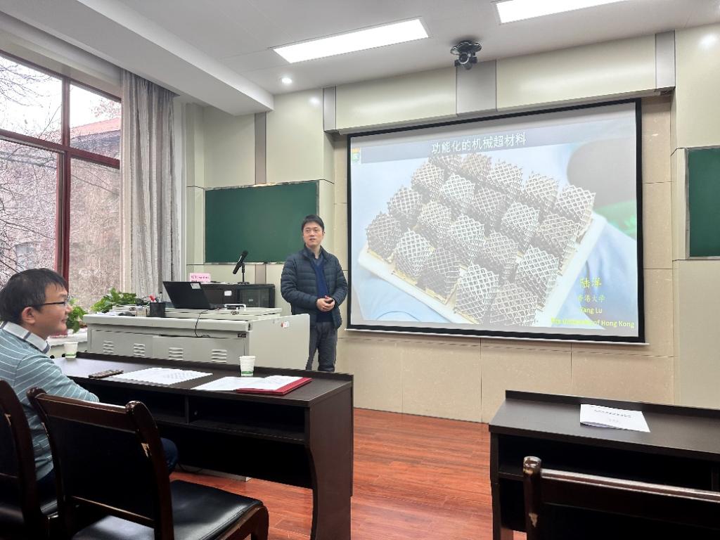 聘任仪式结束后,陆洋教授为参加会议的老师与同学作了题为《功能化的机械超材料》的学术讲座,学术讲座由3003新葡官方网站凡正杰副教授主持。陆洋教授结合研究经历,对机械超材料通过其微纳结构的设计来实现对宏观力学性能的调控进行了深入阐释,表明通过对多功能的机械超材料的深入研究,将带动高性能结构设计和先进制造领域新的范式转变,对包括能源和生医工程等领域应用能够提供新的启发。汇报结束后,参加学术讲座的老师与同学针对多功能的机械超材料具体制备工艺方法及工程化应用过程中存在的问题与陆洋教授进行了详细的交流。
