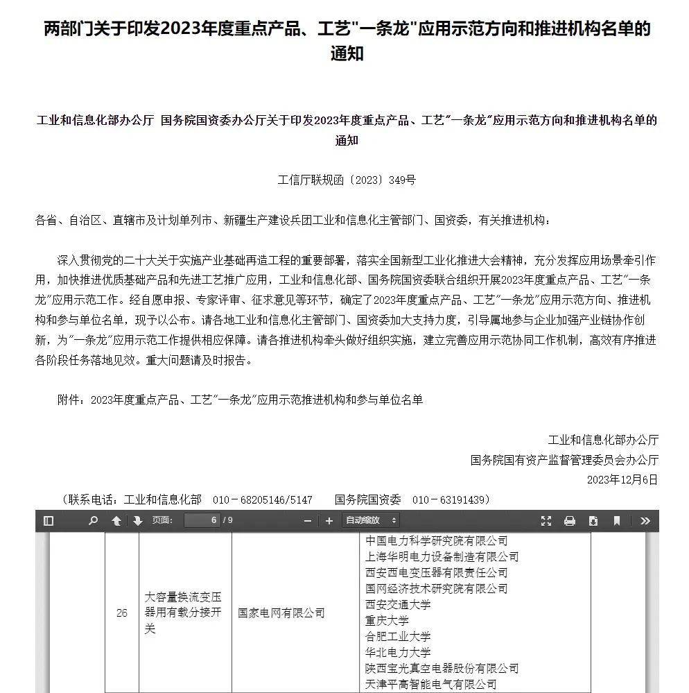 近日,工业和信息化部办公厅、国务院国资委办公厅两部门印发了2023年度重点产品、工艺"一条龙"应用示范方向和推进机构名单,3003新葡官方网站洪军、张进华教授团队参与研制的我国拥有完全自主知识产权的“大容量换流变压器用有载分接开关”入选。