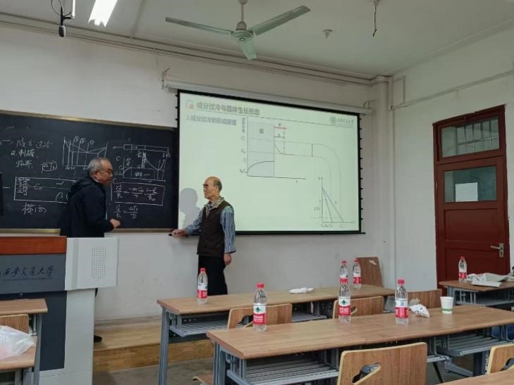 针对目前年轻教师在授课时出现的问题,范群成教授以铸造成形中成分过冷相关知识为切入点,进行了示范授课。通过观察老冰棍的断口组织形貌特征,导入课程,基于板书,带领课程组教师,学习了成分过冷的定义和判据的推导过程。范老师强调,年轻教师在授课时,务必要把握住所讲知识点的本质与核心,在重要的公式推导时,化繁为简,将复杂的知识,采用简单明了的方法,传授给学生。