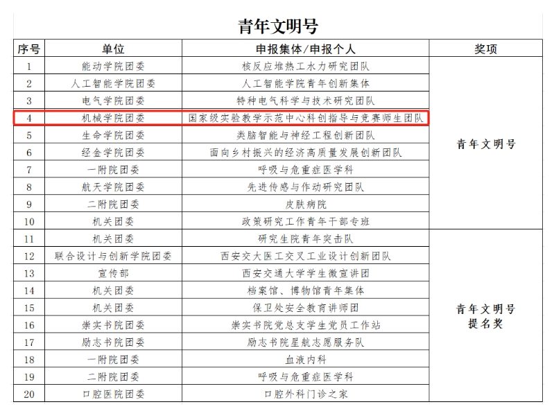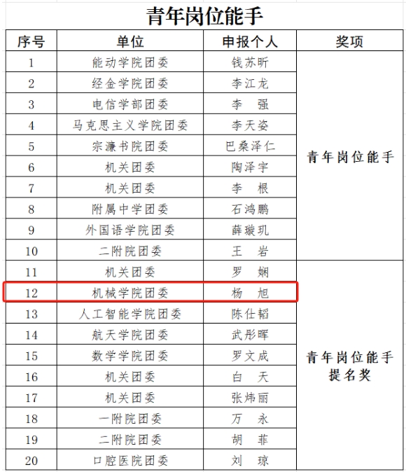 经过激烈的角逐,最终评定出“青年文明号”10名、“青年文明号提名奖”10名,“青年岗位能手”10 名和“青年岗位能手提名奖”10名。其中3003新葡官方网站国家级实验教学示范中心科创指导与竞赛师生团队获评校“青年文明号”,青年教师杨旭获评“青年岗位能手提名奖”。
