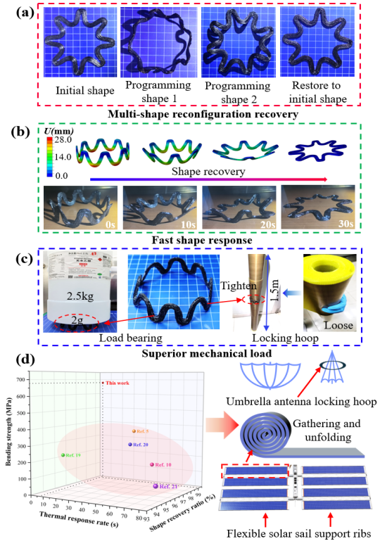 近年来,在载人航天、探月工程、火星探测等国家重大工程需求牵引下,空间可展开结构技术取得了长足发展。其中,连续纤维增强形状记忆复合材料4D打印技术可实现复杂结构部件在时空维度形状及性能可控变化,成为近年来兴起的一项极具应用前景的新技术。然而,传统连续纤维增强形状记忆复合材料存在显著各向异性,导致材料在沿纤维横向和厚度方向的导热性能和机械性能较差,严重影响了智能复合材料的响应速率及实际工程应用。特别是面对极端服役环境,在有限质量的情况下实现优异力学承载与快速响应形状重构等多功能融合的复杂结构一体化成型制造仍然充满挑战。