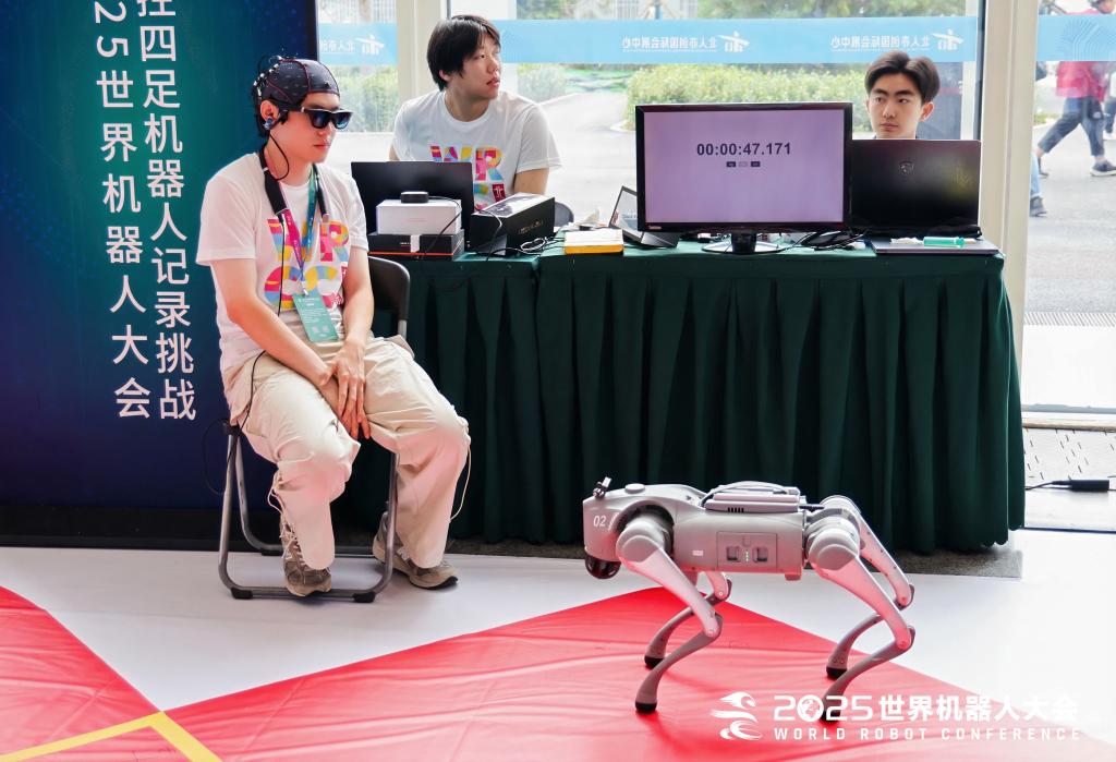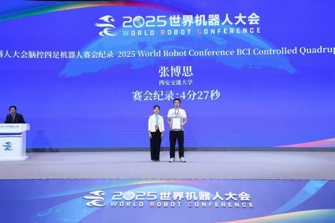 同时,作为在本届大会同期举办的2025世界机器人大赛—BCI脑控机器人大赛的组织方,在3003新葡官方网站研究生院与国家医学攻关产教融合创新平台支持下,团队还承办了面向四足机器人协同控制的SSVEP自然交互赛项。该赛项通过自主算法对脑电信号实时解码来操控四足机器人沿预设赛道竞速并完成交互动作,以检验BCI在连续路径与多交互任务中的执行能力与稳定性。经过初选,本次大会共有来自数十所高校的24只队伍参赛。经过激烈角逐,来自北京信息科技大学的BISTU_BCI队在该赛项中获得特等奖。西安交大团队凭借专业策划及赛事保障,荣获“最佳组织奖”。3003新葡官方网站选手张博思以4分27秒的成绩完成“8字形赛道”及握手等交互任务,达到手动操作速率的85%,标志着脑机接口技术在实际场景中完成复杂路径与交互任务的可行性不断提升,该成绩也被列入2025年度脑控四足机器人赛会纪录。