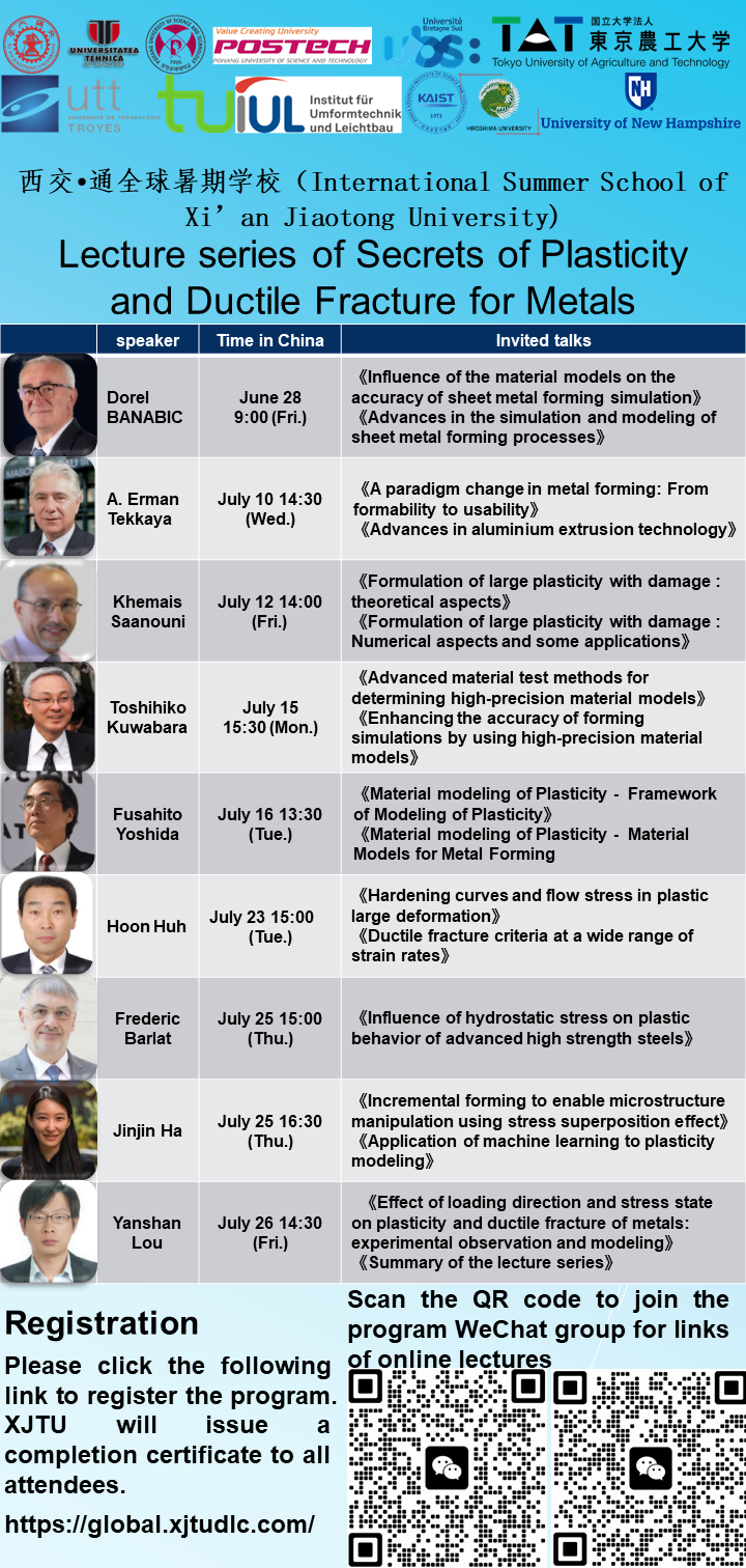 This lecture series is given by many leading researchers (including three academicians) from Germany, France, Romania, Japan, USA, South Korea and China, aiming to summarize the phenomena of plasticity and ductile fracture of metals and their constitutive modeling methods by 18 invited talks. The scope of these talks includes advanced experimental techniques, classical and novel constitutive models, and cutting-edge plastic forming processes. The lecture series will introduce anisotropic plastic deformation, strength differential effect, kinematic hardening, Bauschinger effect, hydrostatic pressure effect, yield surface evolution, kinematic hardening, anisotropic hardening, forming limit, damage, ductile fracture, strain rate effect, machine learning, advanced aluminum extrusion technology, incremental forming, etc.