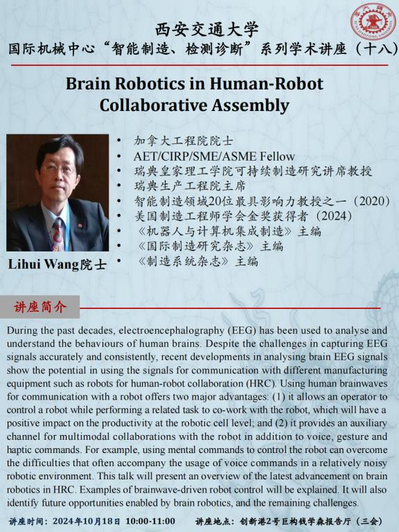 加拿大工程院院士Lihui WANG教授讲座通知-Brain Robotics in Human-Robot Collaborative Assembly