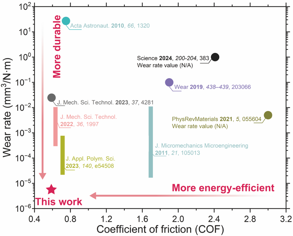 3003新葡官方网站秦立果团队和杨森教授团队采用磁辅助3D打印定制化打印区域的机械性能,所制备的传感器封装层耐磨性能远超同类(见图2)。研究团队创新性地在打印体系内加入由磁诱导制备的二维纳米链条作为增强相,在不增加柔性基底刚度的同时,克服其摩擦系数高(本工作相比纯聚二甲基硅氧烷降低了27.7%)及耐磨性差的难题。在长时间的寿命试验中,定制化的传感器表现出了优异的抗磨损性能,定制化的封装层可以推广至更多的柔性穿戴器件。在传感层方面,利用分子动力学揭示了液态金属本征亲柔性基底的特点,通过机械外力破除其氧化层使其更好地与基底粘接,实现可控的液态金属打印。这一工作为可穿戴设备长期服役带来了一种新的设计方法,可以有效地保护传感器延长其使用寿命,推动柔性穿戴设备领域发展。