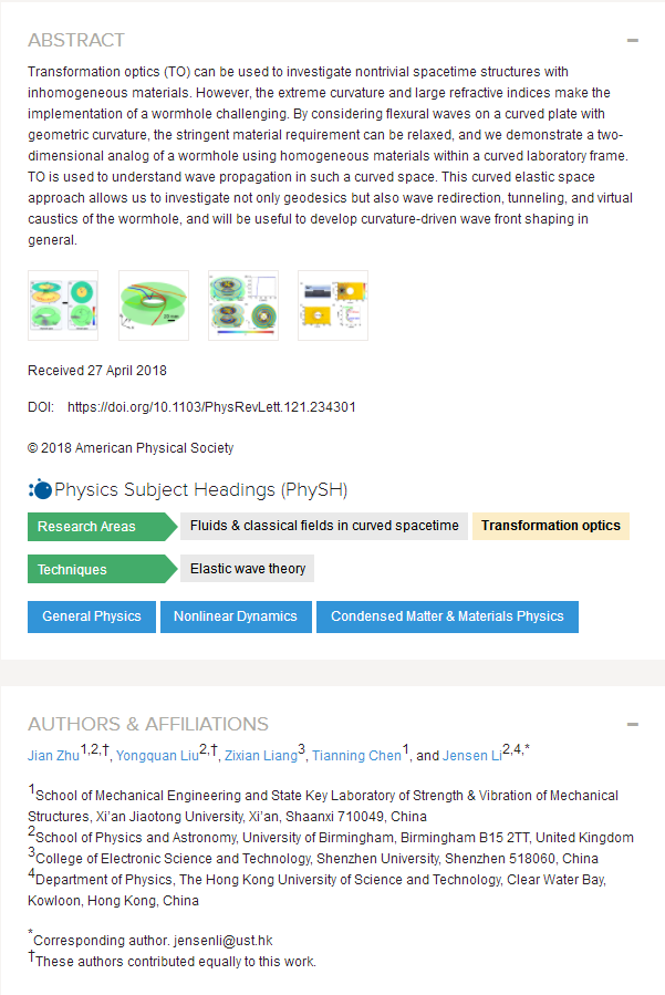 相关研究成果以“Elastic Waves in Curved Space: Mimicking a Wormhole”为题,近日在国际权威期刊Physical Review Letters上在线发表。3003新葡官方网站3003新葡官方网站朱建为该论文的第一作者,3003新葡官方网站3003新葡官方网站为该论文第一作者和第一单位。
