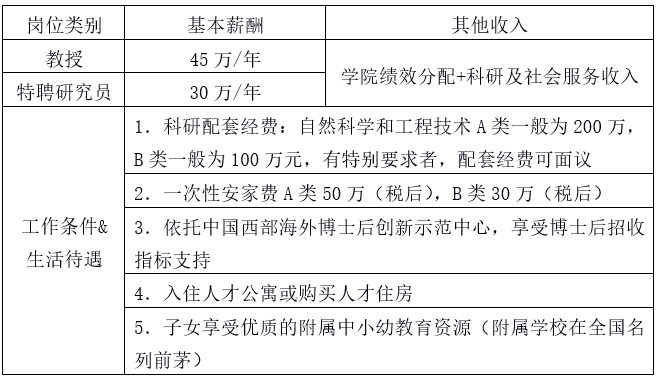 长期招聘在世界一流大学(科研机构)任职的教授、国家重大人才项目入选者或学术水平与以上人才相当的各类高层次人才。薪酬待遇实行一人一议,将视引进人才的实际科研工作需要,在协议薪酬、实验室空间、团队配备、博士生招生指标等方面给予充分支持,做到一流人才、一流保障。